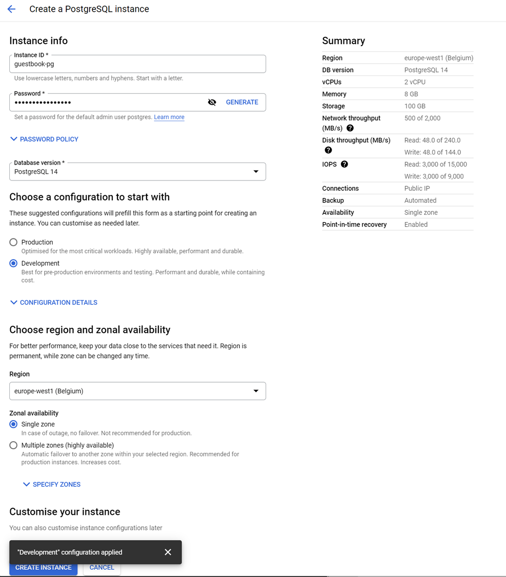 Create a unique instance-name, generate a password AND REMEMBER IT. (If you are on your own account you can reduce cost by setting Developement and Single zone)