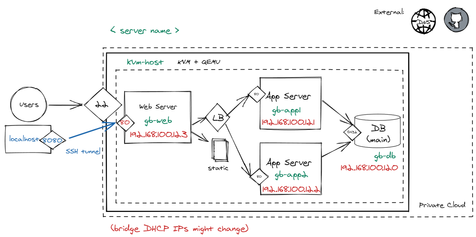 $ sudo qemu-system-x86_64 ./gb-db.qcow2 \ -m 512M -smp cpus=1 --enable-kvm \ -nic bridge,br=vmbr0,mac=52:54:00:12:34:56 \ -nographic < /dev/null > gb-db.out & $ echo $! > gb-db.pid # Save pid file in case we need to force shutdown $ sudo qemu-system-x86_64 ./gb-app1.qcow2 \ -m 512M -smp cpus=1 --enable-kvm \ -nic bridge,br=vmbr0,mac=52:54:00:12:34:57 \ -nographic < /dev/null > gb-app1.out & $ echo $! > gb-app1.pid # Save pid file in case we need to force shutdown $ sudo qemu-system-x86_64 ./gb-app2.qcow2 \ -m 512M -smp cpus=1 --enable-kvm \ -nic bridge,br=vmbr0,mac=52:54:00:12:34:58 \ -nographic < /dev/null > gb-app2.out & $ echo $! > gb-app2.pid # Save pid file in case we need to force shutdown $ sudo qemu-system-x86_64 ./gb-web.qcow2 \ -m 512M -smp cpus=1 --enable-kvm \ -nic bridge,br=vmbr0,mac=52:54:00:12:34:59 \ -nographic < /dev/null > gb-web.out & $ echo $! > gb-web.pid # Save pid file in case we need to force shutdown