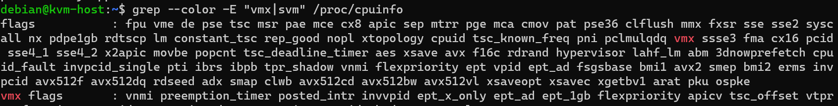 $ grep --color -E "vmx|svm" /proc/cpuinfo
