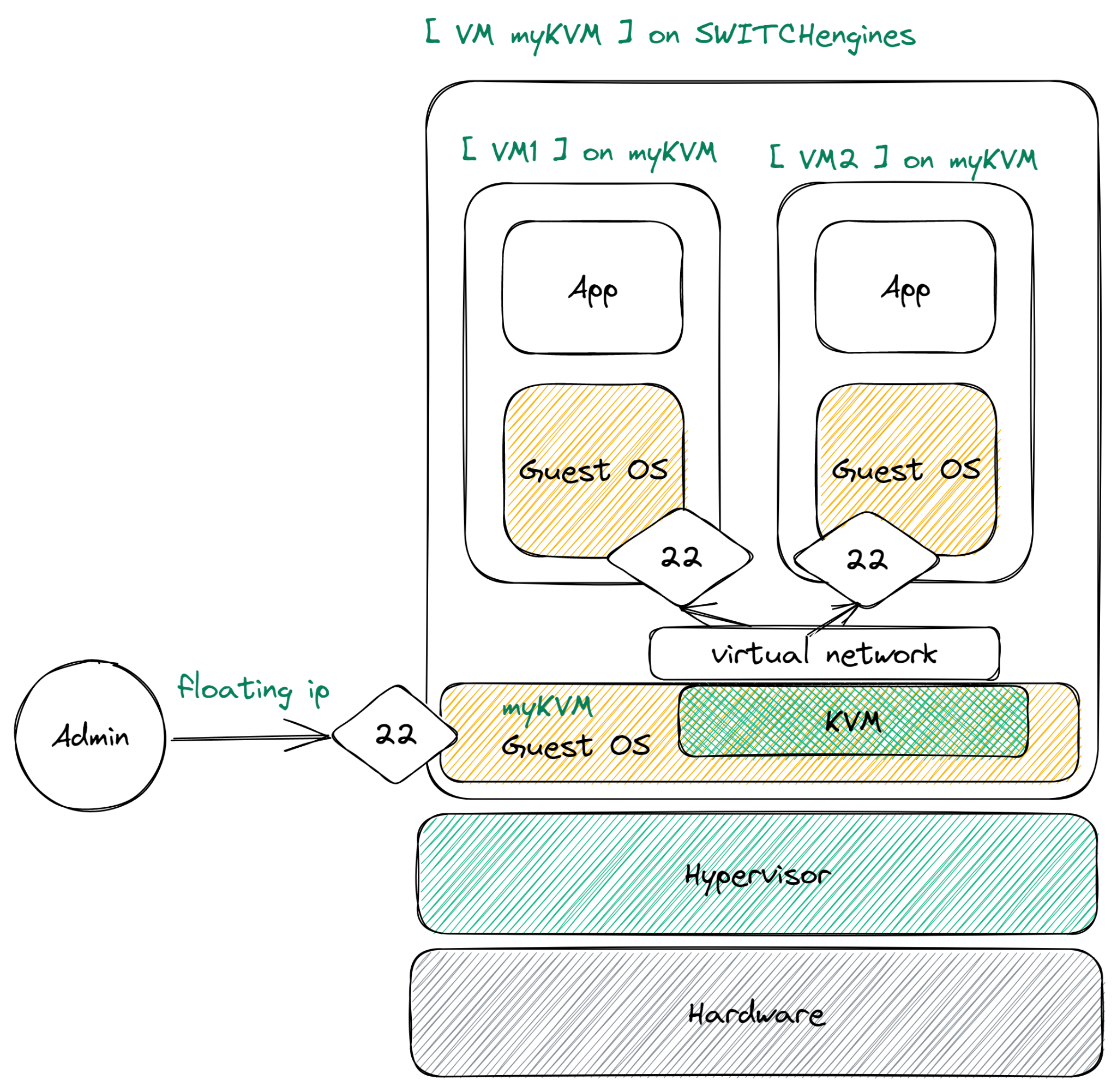To avoid polluting personal files, we'll run all those vms in SWITCHengines VM with a concept called "nesting" (using a form of virtualisation inside a virtual machine). However, we'll pretend that we're running on a barebones machine.