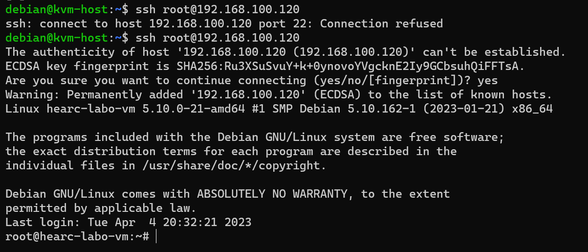 Right now we are using the new VM from terminal (as we would be connected on a physical computer), but we want to use remote ssh, just like how we are using the host vm at the moment. By default the ssh server daemon (called sshd) is not launched on a nocloud image. You can try starting it up by entering the following command.