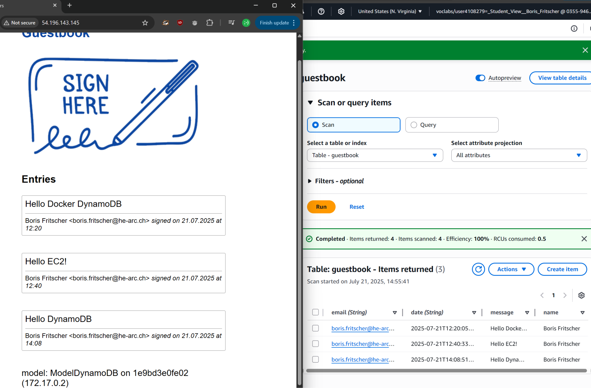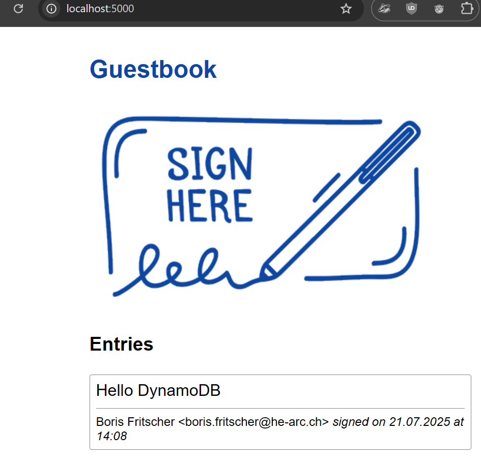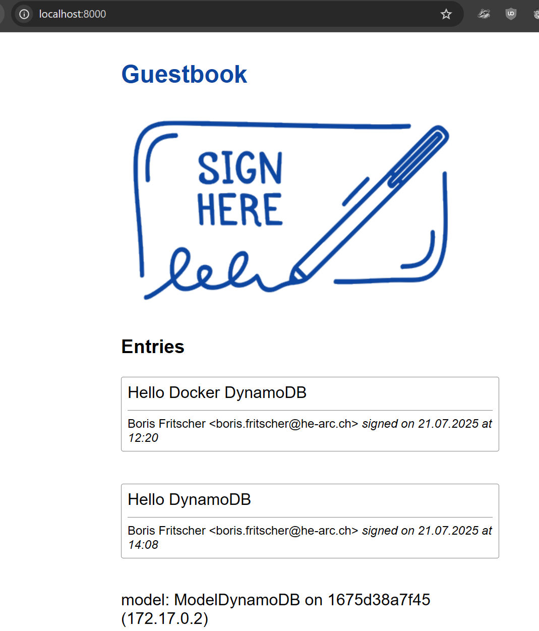 Bring up a browser and visit the application via http://localhost:8000. Sign the guestbook with your name and e-mail address with the message "Hello Docker DynamoDB".