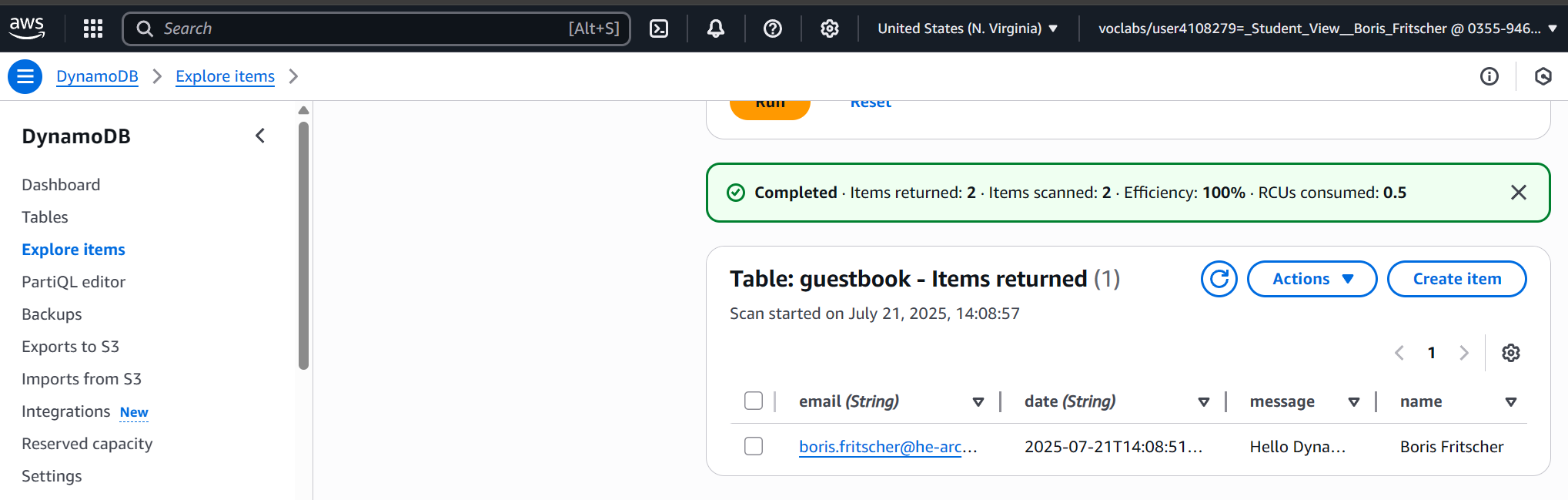 Go back to the table in DynamoDB. Explore the table items to see the entries in the Guestbook.