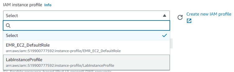 Finally, in the Advanced section of the instance, locate the settings for specifying an IAM instance profile to associate with the VM. The pre-defined role LabInstanceProfile contains permissions to utilize DynamoDB. Select the role.
