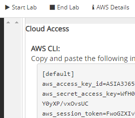 boto3 requires a valid set of AWS credentials in order to authenticate properly to the backend DynamoDB instance of your AWS account. Unfortunately, our classroom environment will not allow us to create credentials of our own that have least privileges. We will instead use the full credentials of the account we are given. Account credentials can be obtained via the Vocareum "AWS Details" UI as described at the beginning of the course in the AWS Academy setup. Then, next to the "AWS CLI", click on the "Show" button to reveal the account's key information.