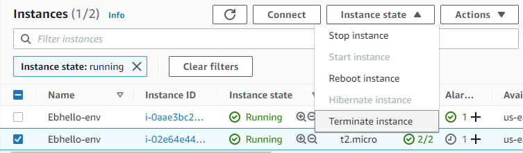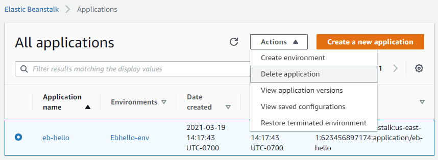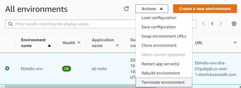 In order to take down our application, go back to the Elastic Beanstalk console and click on the "eb-hello" application. Then in "Actions", select "Terminate environment" to bring down the running environment and its deployed resources.