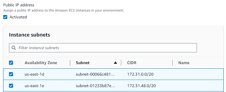 Select the default VPC, activate public IP addresses, and select all subnets within us-east-1 for the load balancer.