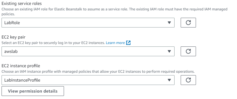 We will need to configure a service role, the EC2 key pair and the instance profile for the application. Use the LabRole and LabInstanceProfile that have been pre-defined for your AWS environment. Then, continue to the rest of the configuration.