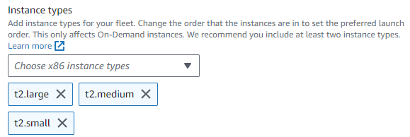 Within the Instance types dropdown, select multiple t2 machine types to allow Elastic Beanstalk some flexibility in the machines that are used to bring up your application (e.g. t2.large, t2.medium, etc.)