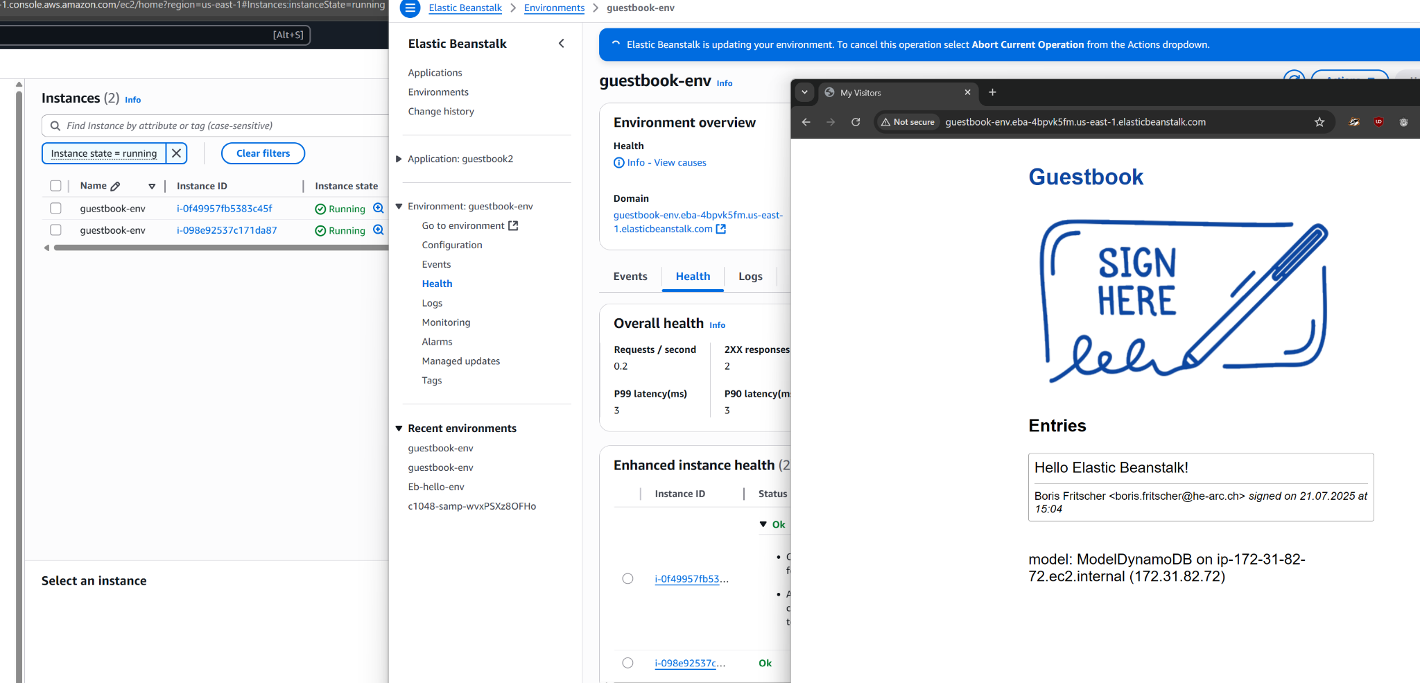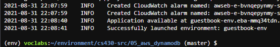 Elastic Beanstalk will automatically create all of the infrastructure (e.g. EC2 instances, Load balancers, VPCs, subnets, security groups, etc.) to run your application. This is done using the Cloud Formation service of AWS. Observe the output of Cloud Formation as it scrolls across to see the kinds of resources that are automatically set up for you to run the application and pause to appreciate how fortunate we are not to have to do it manually.