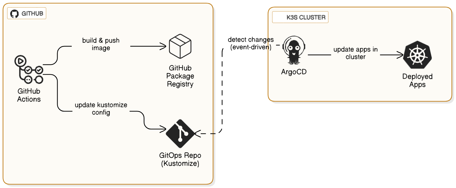 This creates a powerful, automated loop: git push -> build & test -> publish image -> update config -> deploy to kubernetes.