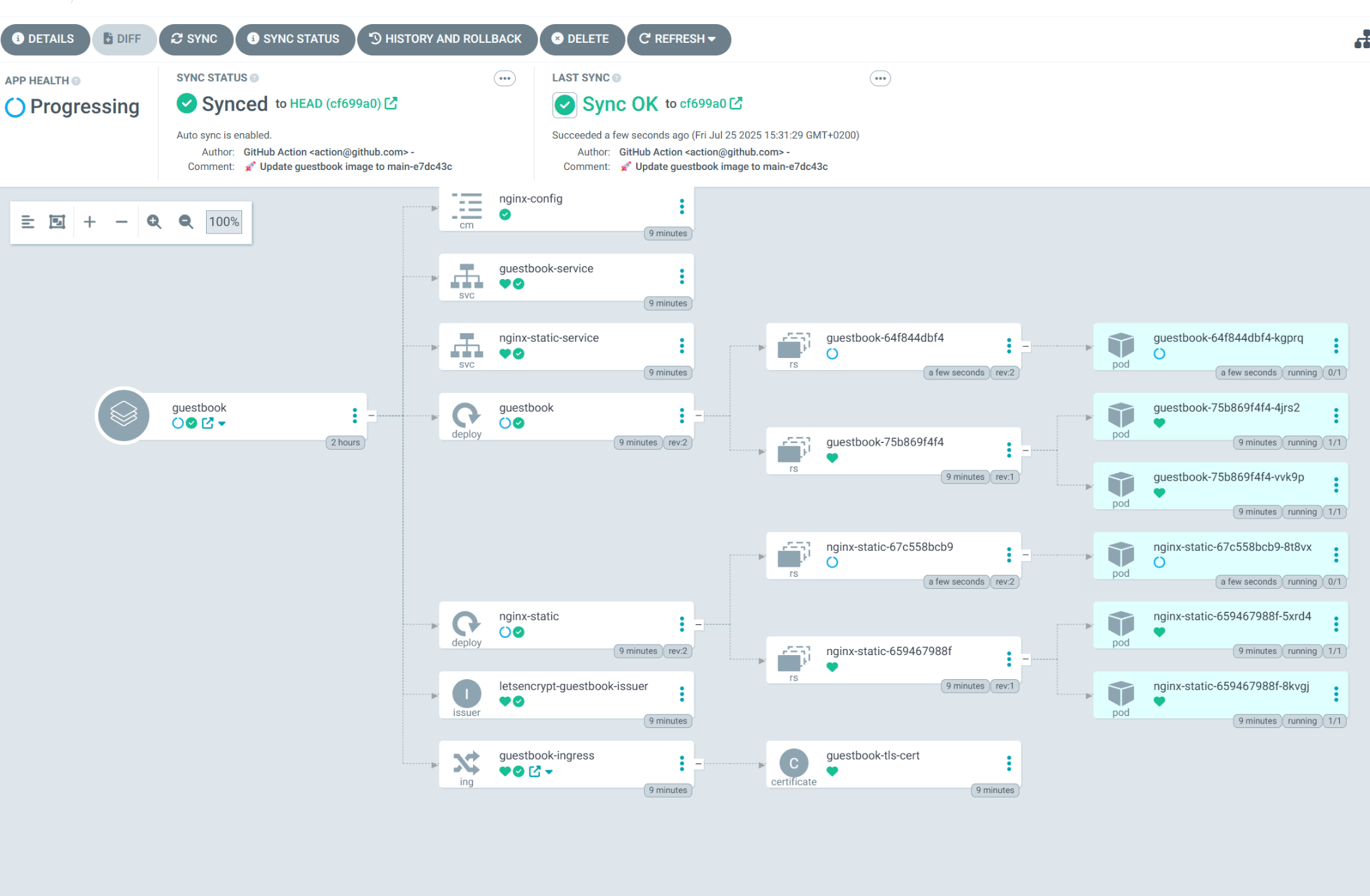 Once the application is Synced and Healthy again, refresh the guestbook page in your browser. You should see the new title, "My GitOps Guestbook". The entire update happened automatically after your git push.