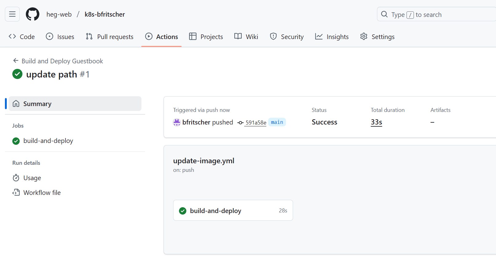 CI (GitHub): Go to the Actions tab in your GitHub repository. A new workflow is running. Wait for it to build the new image and push the commit that updates the image tag.