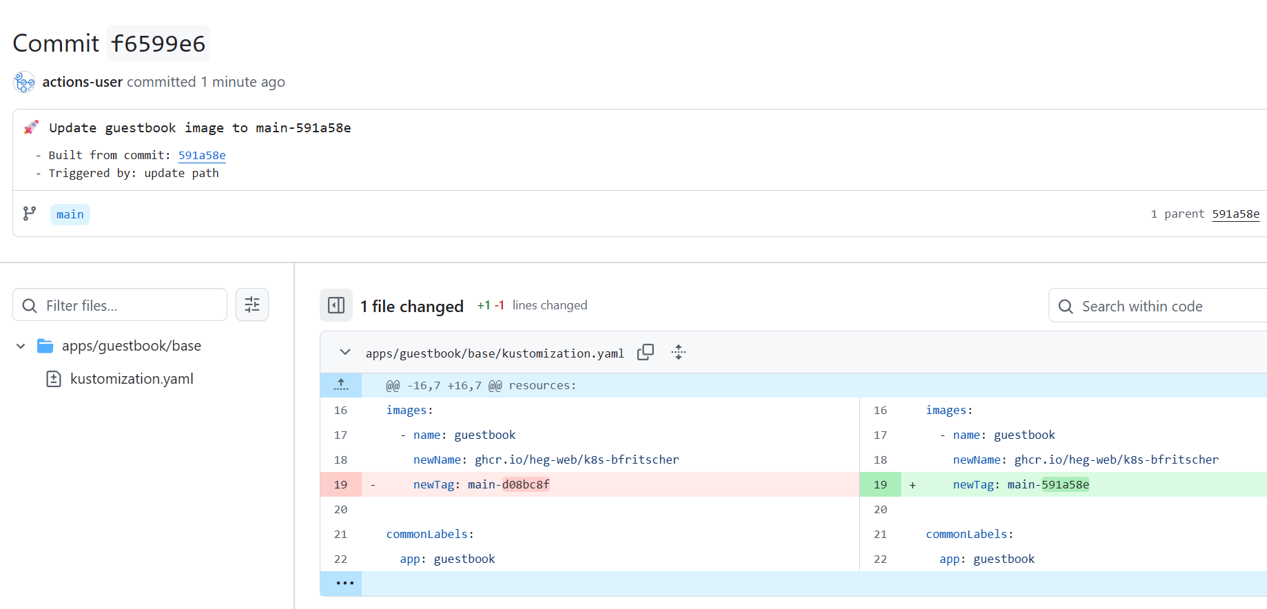Once it completes, go to your repository's main page. You will see a new commit authored by "github-actions[bot]". This commit updated the image tag in the apps/guestbook/base/kustomization.yaml file.