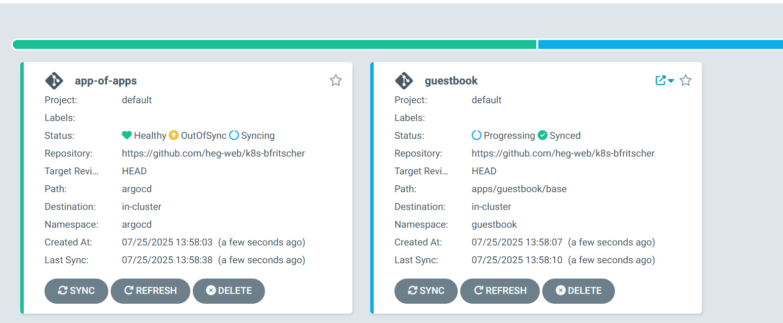 In another new terminal, navigate to your cloned guestbook-gitops repository directory and apply the root app manifest. Keep the other proxy open and your browser window open to see the live changes.