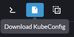 First, get the kubeconfig file for your cluster from the Rancher UI. Go to the local cluster dashboard, and in the top right, click the Kubeconfig button.